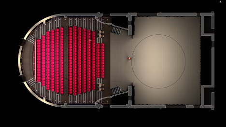 площади фигур слева и справа (зала и сцены) практически равны. Не соответствует только театральному мейнстриму геометрия той и другой фигуры. кажется, было бы лучше каким-то образом зал «вписать» в сцену (превращая последнюю — функционально — в арену цирка).