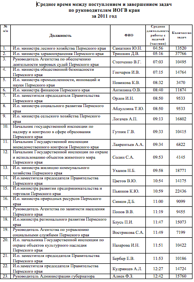 Система электронного оборота нужна для понимания внутренних процессов, для прозрачности. Данная таблица говорит о том, сколько документов обработал в прошлом году каждый руководитель, и сколько часов в среднем пролеживал у него на электронном столе документ. То есть насколько конкретный человек задерживал общий процесс. Уже писал о том, что в силу разных причин, командировок и прочего (причину всегда можно найти :)) я не показывал пример в прошлом году своим коллегам. Но то, что я оказался на последнем меcте, — для меня неожиданность :(. Документы лежали у меня на столе около 38 часов (включая ночные), то есть полтора дня. Думаю, что этот показатель не должен превышать восьми часов. Попробуем.