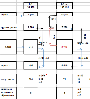 Таблица сделана для внутреннего пользования, поэтому многие сокращения могут быть непонятны, но при желании разобраться можно. «н» — норма, «р» — группа риска, «с»  или «СОП»- социально опасное положение. «ЛРП» — лишение родительских прав, «оод» — общественно опасное деяние.
